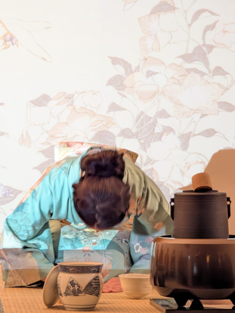 La maestra del tè Senyo Machida ha fatto magnificamente rivivere la magia, la solenne gestualità, l’eleganza degli abiti, la preziosità degli oggetti dell’antica cerimonia del tè.