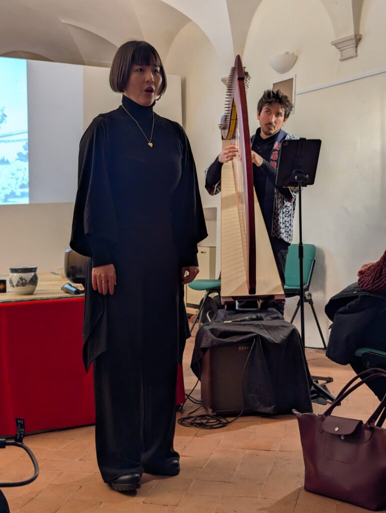 L’incontro è stato impreziosito e contrappuntato dalla soave voce del soprano Onoka Aoki magistralmente accompagnata dall’arpa di Emiliano Martinelli.